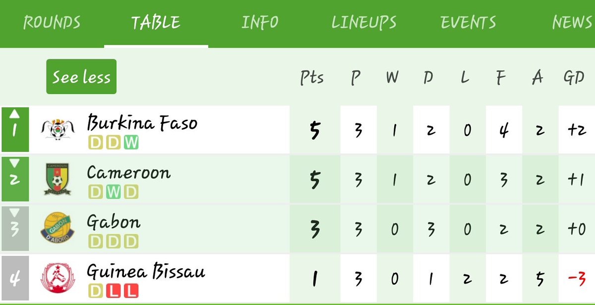 Kwa bahati mbaya AFCON 2017 imeshuhudia mwenyeji Gabon akiaga mashindano hayo kutokana na kulazimishwa sare tasa na timu ya taifa ya Cameroon, hiyo inakuwa sare ya tatu kwa Gabon ambapo sare hiyo imewafanya wafikishe point tatu na kuambulia kushika nafasi ya tatu huku Guinea Bissau wakishika mkia. Cameroon na Burkinafaso wao wanatinga moja kwa moja robo fainali ya AFCON kufuatia kufikisha point 5 kila mmoja, Burkinafaso anafuzu baada ya kuifunga Guinea Bissau kwa goli 2-0 katika mchezo wa leo, hivyo wapo nafasi ya kwanza wakiwa na point 5 sawa na Cameroon lakini wanaongoza kwa tofauti ya magoli
